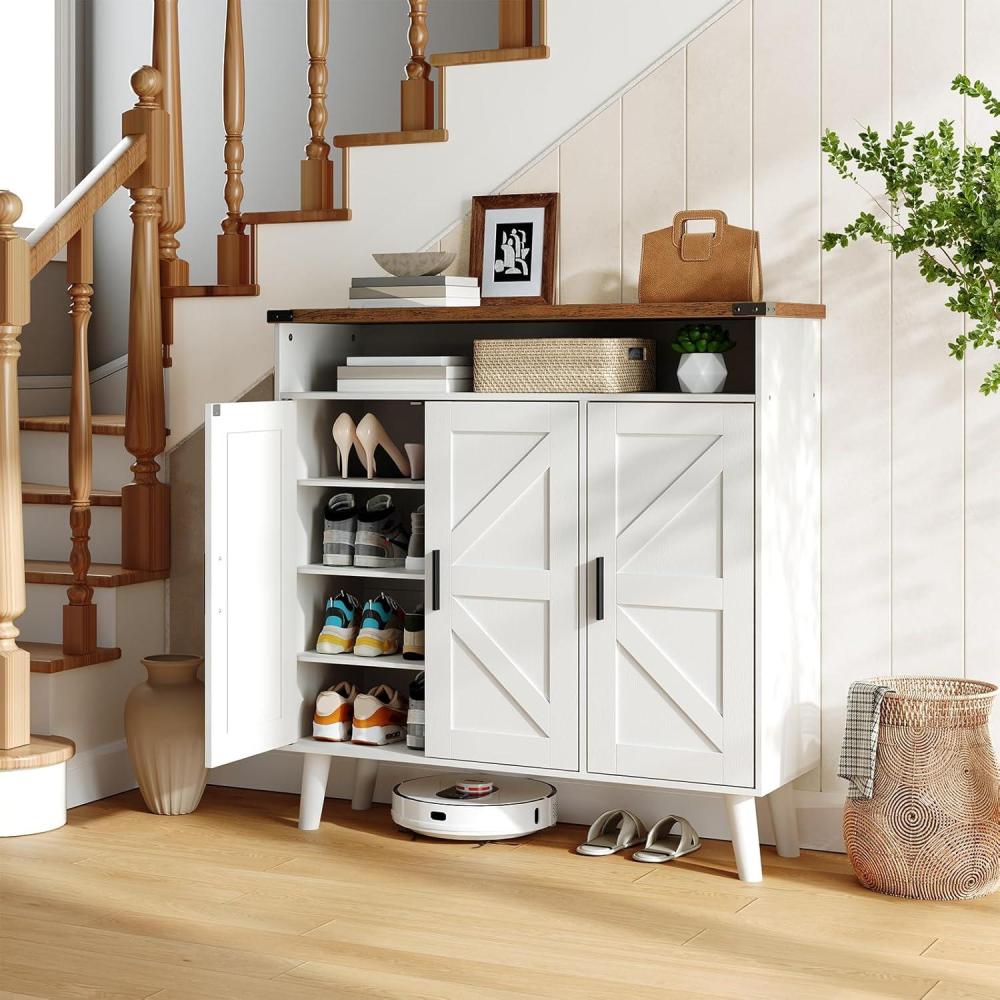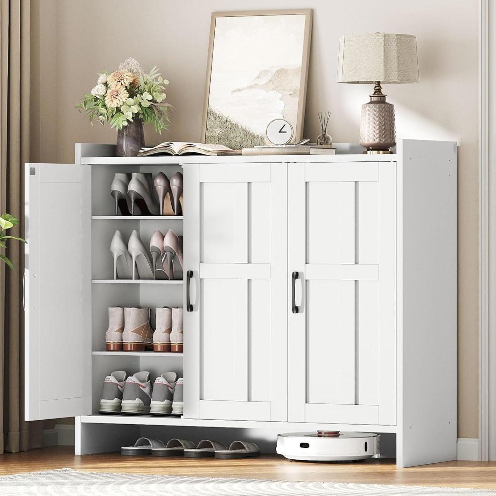 HOOBRO Shoe Cabinet for Entryway, 42.1″ Large Wooden Shoe Storage Cabinet with 3 Doors, Freestanding Shoe Organizer for Closet, Adjustable Shelves, Farmhouse Style, White WT01SC01(1)