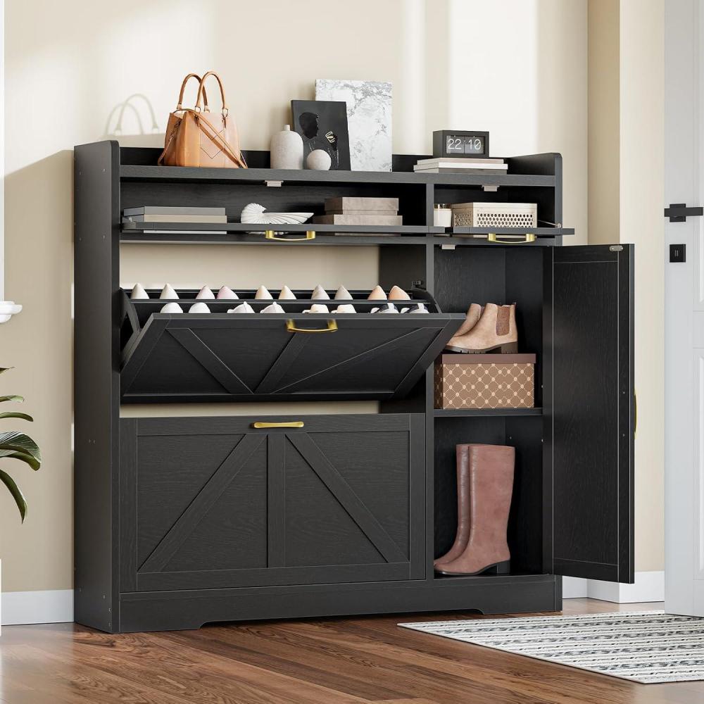 HOOBRO Shoe Cabinet for Entryway, Shoe Organizer Cabinet, Freestanding Shoe Organizer with 2 Flip Drawers, Narrow Shoe Cabinet with Adjustable Side Cabinet, Black BK106SC01