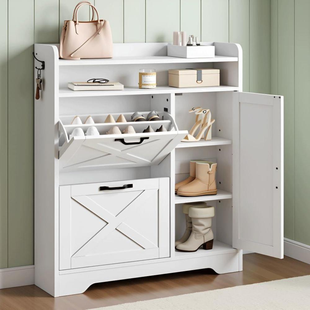 HOOBRO Shoe Cabinet for Entryway, Shoe Organizer Cabinet, Freestanding Shoe Organizer with 2 Flip Drawers, Narrow Shoe Cabinet with Adjustable Side Cabinet, Farmhouse, White and Walnut WH106SC01G1