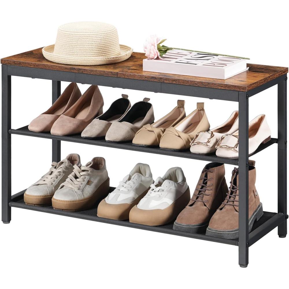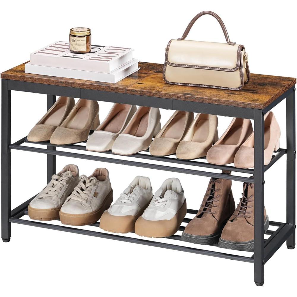 HOOBRO Shoe Bench, 3-Tier Shoe Rack, Industrial Shoe Organizer Storage Bench with Wooden Top, Holds Up to 300 lb, 11.2 x 29.5 x 19.1 Inches, for Entryway, Bedroom, Rustic Brown and Black BF76HX01