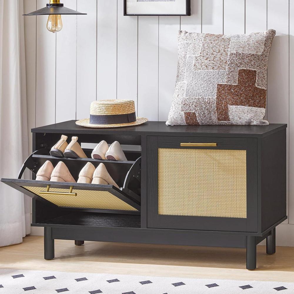 HOOBRO Shoe Storage Bench Entryway, Rattan-Like Shoe Bench with Flip Drawers, Narrow Shoes Rack Cabinet with Rattan Doors, Wooden Organizer for Entryway Hallway, Black BN51HX01