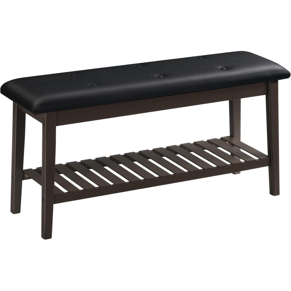 HOOBRO Dining Bench, 2-Tier Bamboo Entryway Bench, Shoe Storage Bench with PU Leather Upholstered Seat, Dining Room Bench for Kitchen, Living Room, Hallway, Entryway, Bedroom, Brown and Black CB70HX01
