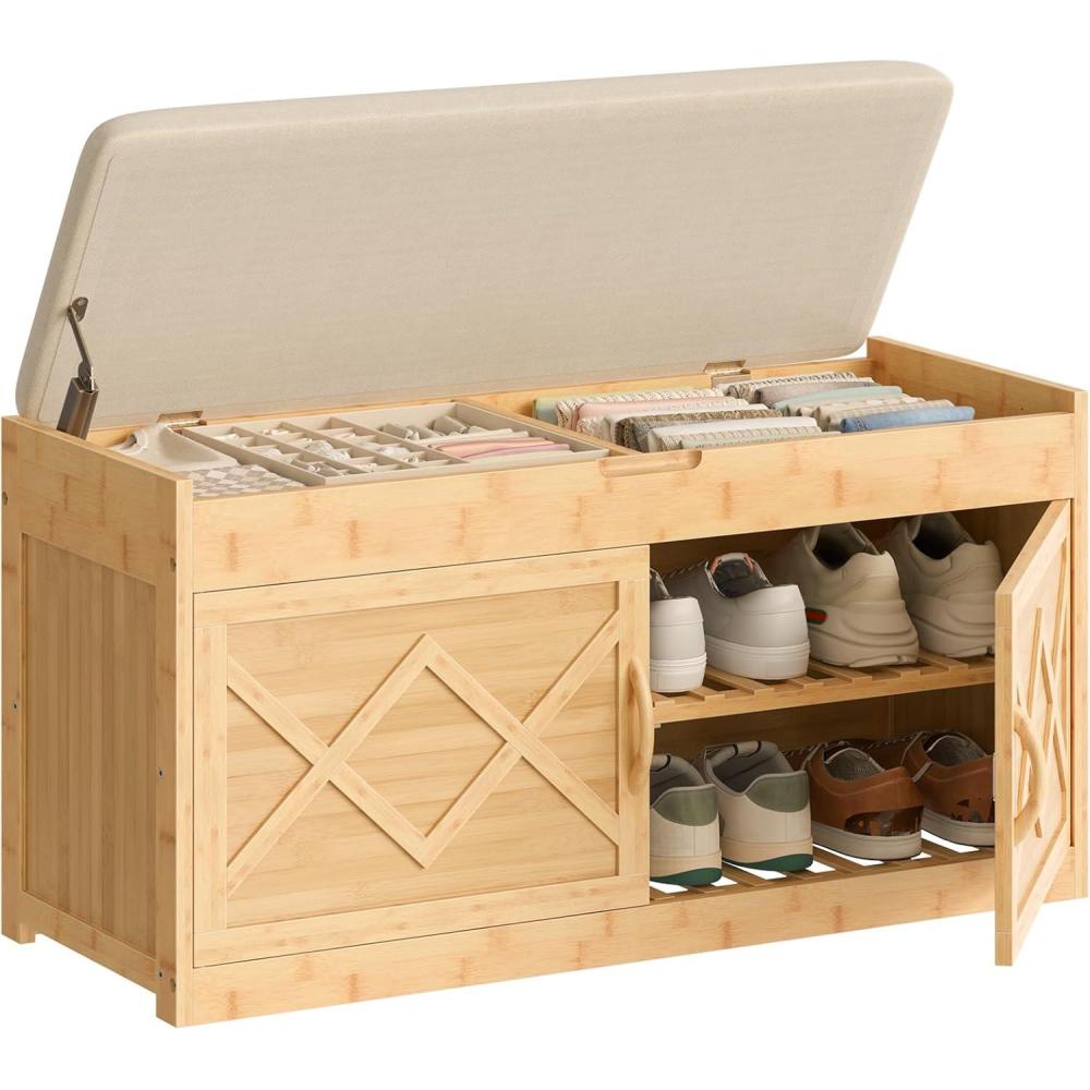 HOOBRO Shoe Bench, Shoe Storage Bench with Cushion, Bamboo Entryway Bench with Hidden Compartment, Storage Bench with Lift Top and 2 Door, for Living Room, Bedroom, Hallway, Beige and Natural YE60HX01