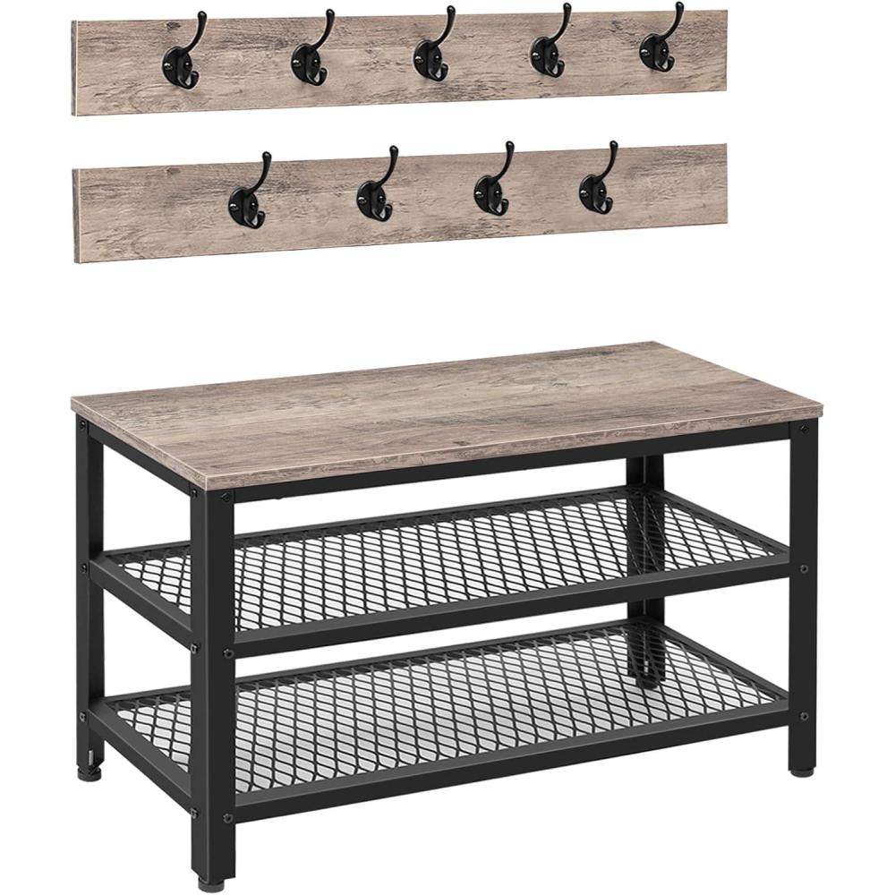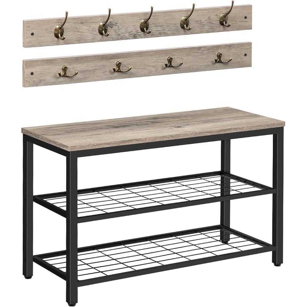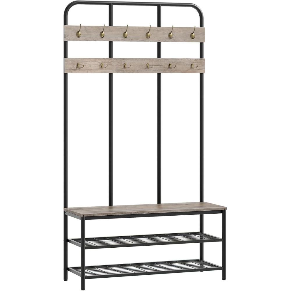 HOOBRO Hall Tree Entryway Storage Bench, Coat Rack Shoe Bench, Shoe Rack Organizer with Coat Hooks, 3-in-1 Design, Wooden Furniture with Metal Frame, Rustic Brown and Black BF17MT01(Greige Black)