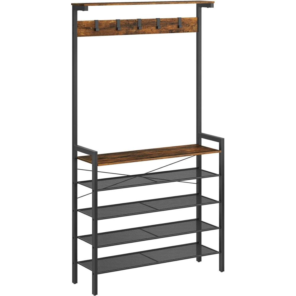 HOOBRO Hall Tree with Bench, Coat Rack with Shoe Storage, Shoe and Coat Rack, 5-Tier Entryway Shoe Storage, 5 Hooks, for 12-16 Pairs, Industrial, Hallway, Foyer, Mudroom, Rustic Brown BF74MT01