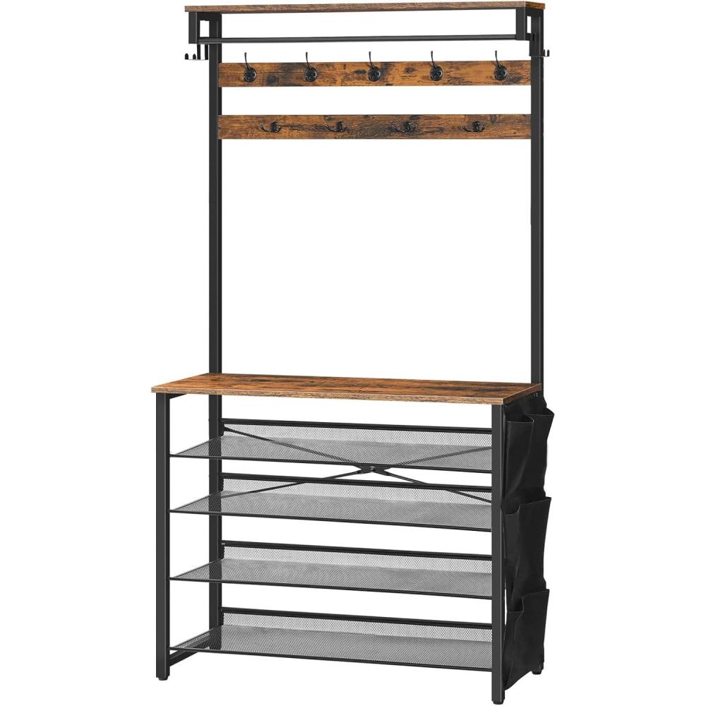 HOOBRO Hall Tree with Bench, Entryway Coat Rack with Shoe Rack, 39.4″ Shoe and Coat Rack, 5 Tier Shoe Storage Organizer with Oxford Fabric Side Pockets, Adjustable Mesh Shelves, Rustic Brown BF76MT01(39.4″L x 12.6″W x 72.8″H)
