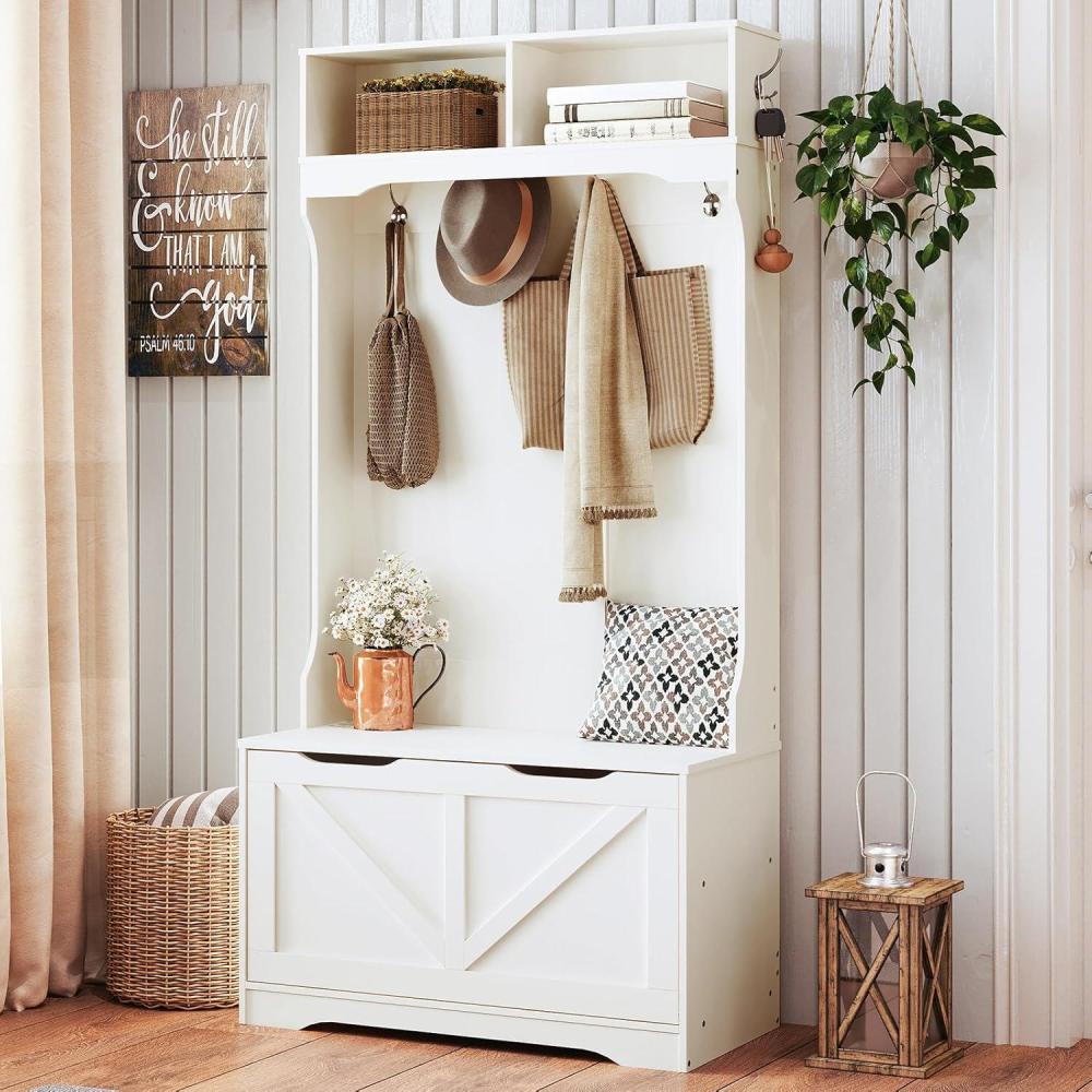 HOOBRO Hall Tree with Bench and Shoe Storage, Entryway Bench with Coat Rack and Shoe Cabinet, Flip-Down Cabinet Door, Coat Rack with Shoe Rack, for Mud Room, White WT84MT01