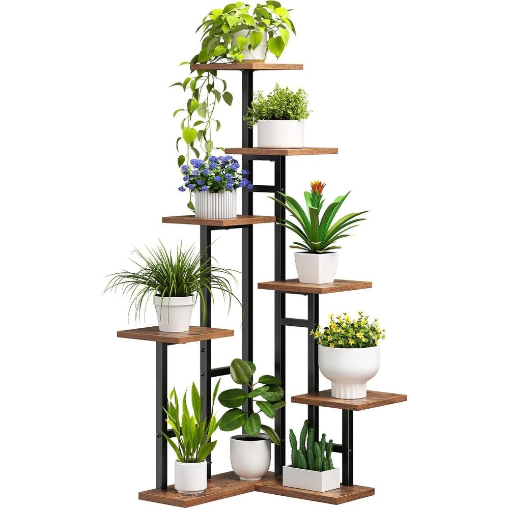 HOOBRO Corner Plant Stand Indoor, 7-Tier Plant Shelf for Multiple Indoor Plants, Corner Plant Rack Organizer, Round Flower Stand, for Living Room, Balcony, Patio, Rustic Brown and Black BF02HJ01(Square)