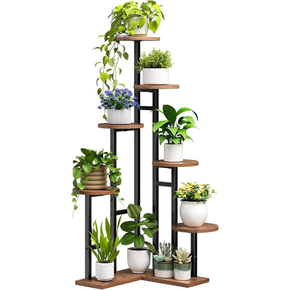 HOOBRO Corner Plant Stand Indoor, 7-Tier Plant Shelf for Multiple Indoor Plants, Corner Plant Rack Organizer, Round Flower Stand, for Living Room, Balcony, Patio, Rustic Brown and Black BF02HJ01(Round)