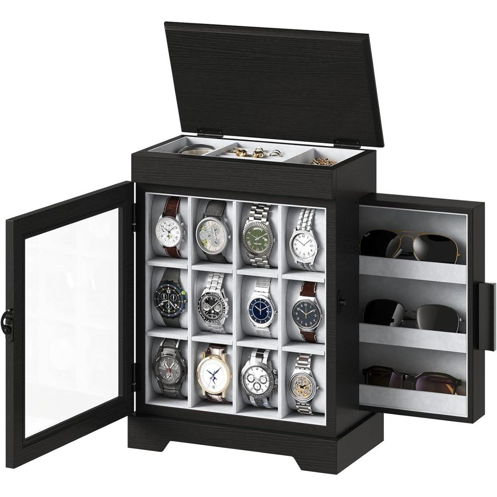HOOBRO 12-Slot Watch Box with Flip-Top Storage, Wooden Watch Case with Acrylic Display, Watch Display Case with Drawer, for Watches, Sunglasses, Walnut BH21JB04(Black)