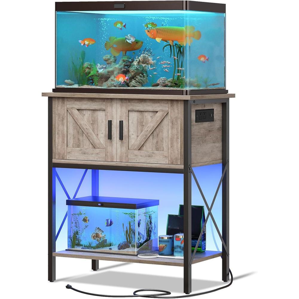 HOOBRO 20 Gallon Fish Tank Stand with Power Outlets and LED Light, Metal Frame Aquarium Stand, Reptile, Turtle Tank Stand with Cabinet Storage, 27.6” L x 15.7” W, 300 LBS Capacity, Black BB40UDFT01(Greige Black)