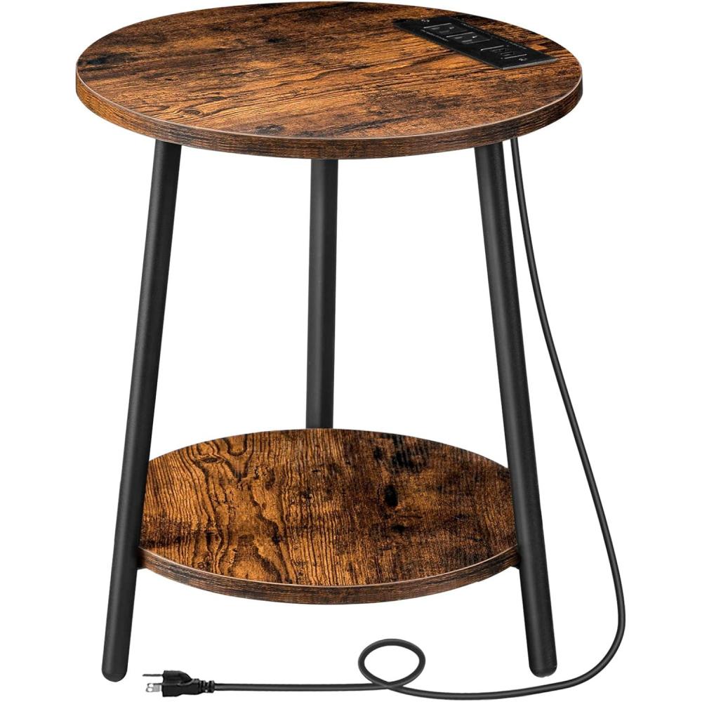 HOOBRO Round End Table with Charging Station, 2-Tier Small Circle Side Table, Round Accent Table for Living Room, Bedroom, Rustic Brown BF671BZ01