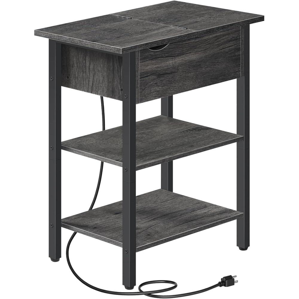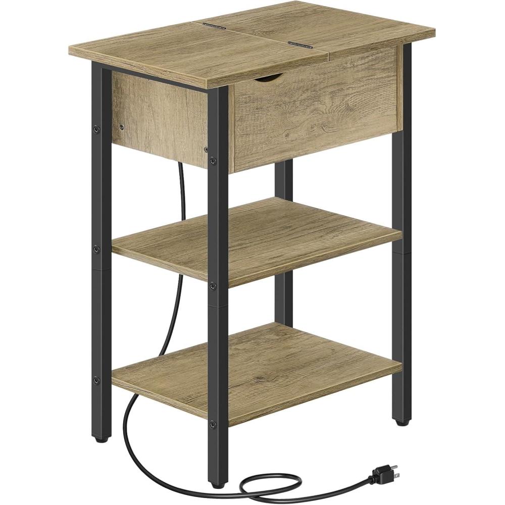HOOBRO End Table with Charging Station, Narrow Side Table, Flip Top Nightstand with USB Ports and Outlets, Bedside Tables with Shelf for Small Spaces, Living Room, Rustic Brown BF341BZ01(Greige black)