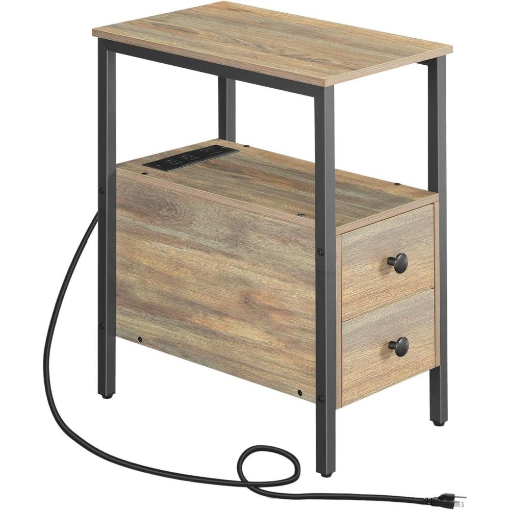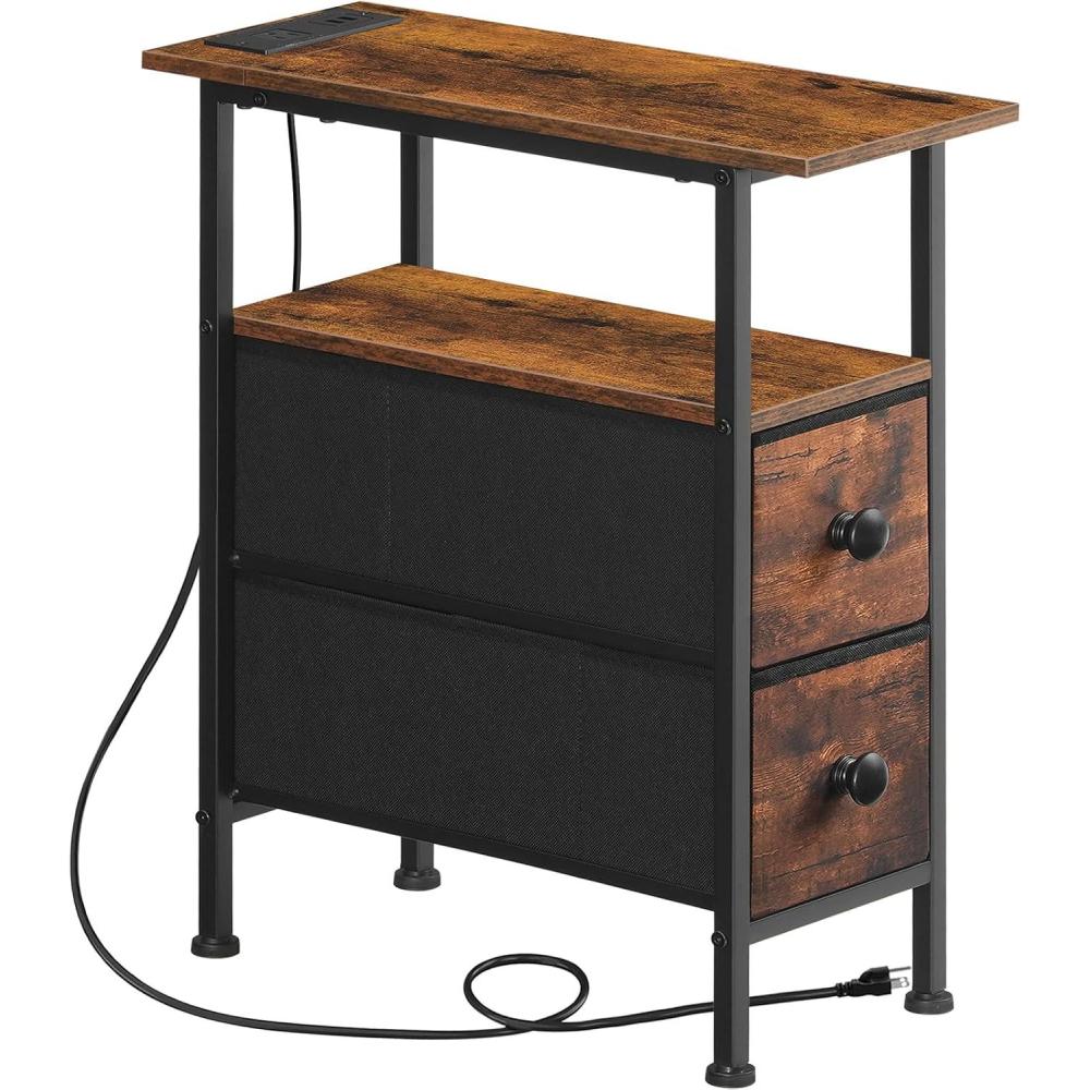 HOOBRO End Table with Charging Station, Narrow Side Table, Nightstand with 2 Non-Woven Drawers, Slim Sofa Side Table, for Small Spaces, Living Room, Bedroom, Rustic Brown and Black BF486UBZ01(Rustic Brown Black)