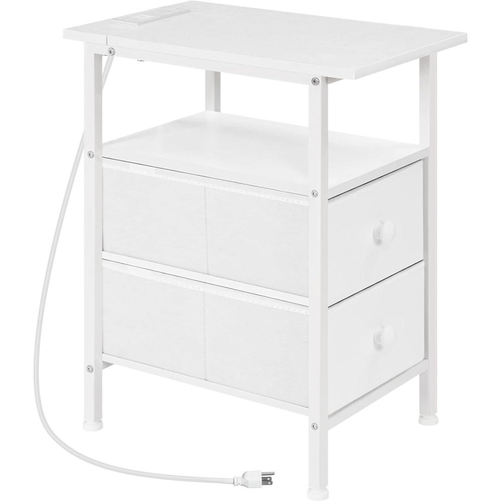 HOOBRO End Table with Charging Station, Narrow Side Table, Nightstand with 2 Non-Woven Drawers, Slim Sofa Side Table, for Small Spaces, Living Room, Bedroom, Rustic Brown and Black BF486UBZ01(White)