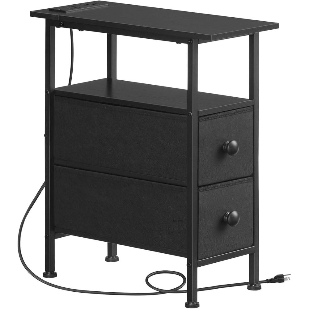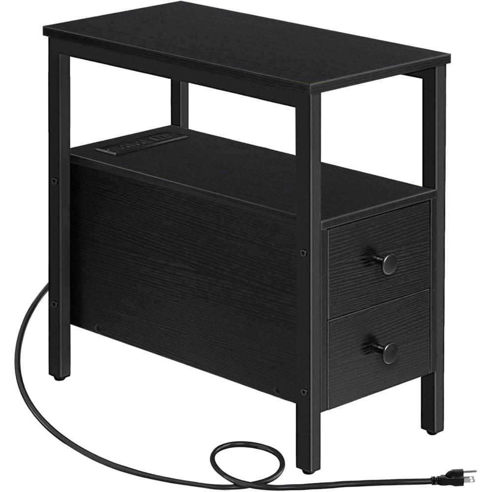 HOOBRO End Table with Charging Station, Narrow Side Table, Nightstand with 2 Non-Woven Drawers, Slim Sofa Side Table, for Small Spaces, Living Room, Bedroom, Rustic Brown and Black BF486UBZ01(Black)