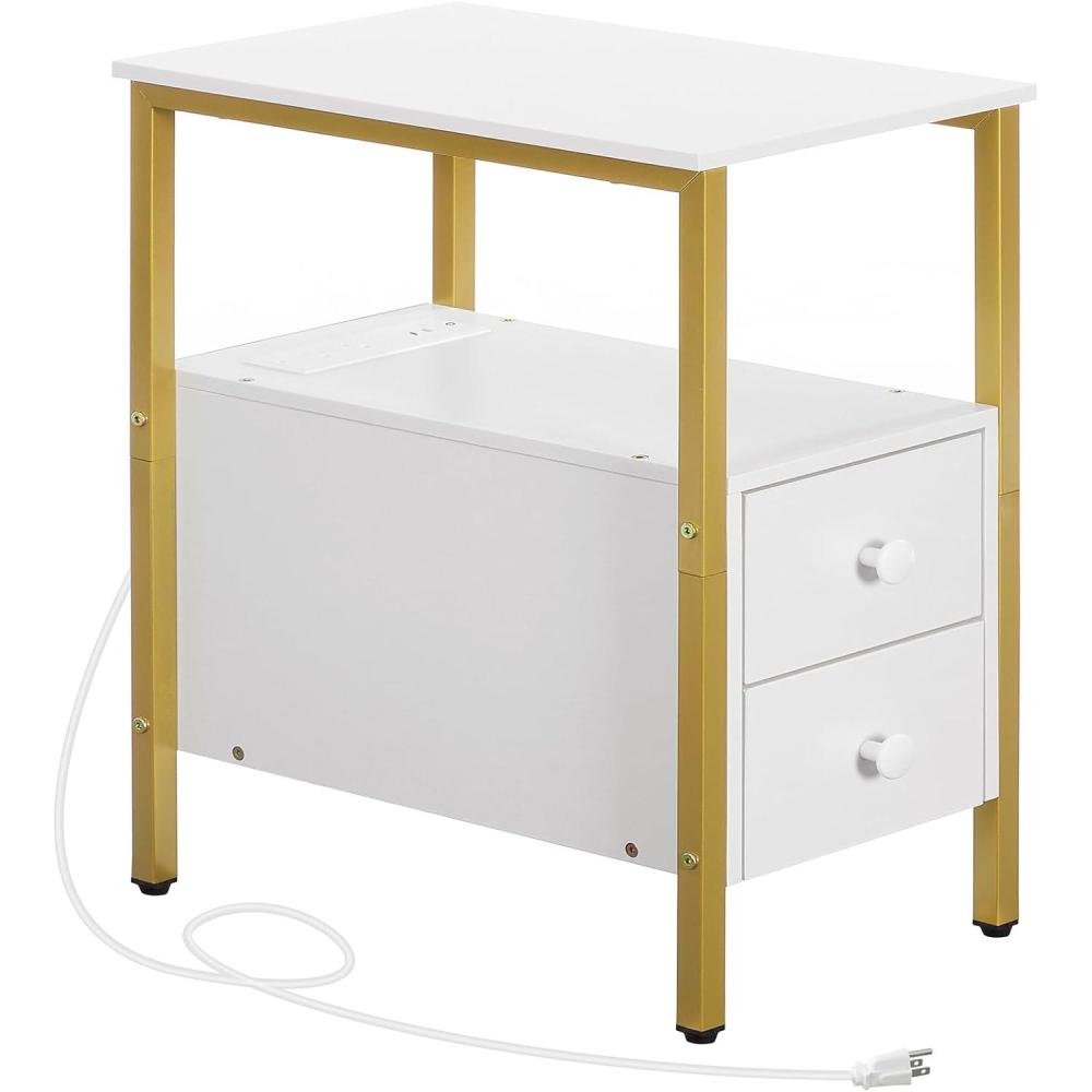HOOBRO End Table with Charging Station, Narrow Side Table with 2 Drawer & USB Ports & Power Outlets, Nightstand for Small Spaces, for Living Room, Bedroom, Rustic Brown and Black BF541BZ01(Gold White)