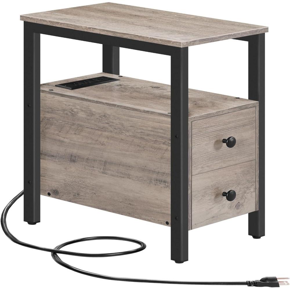HOOBRO End Table with Charging Station, Narrow Side Table with 2 Drawer & USB Ports & Power Outlets, Nightstand for Small Spaces, for Living Room, Bedroom, Rustic Brown and Black BF541BZ01(Greige Black)