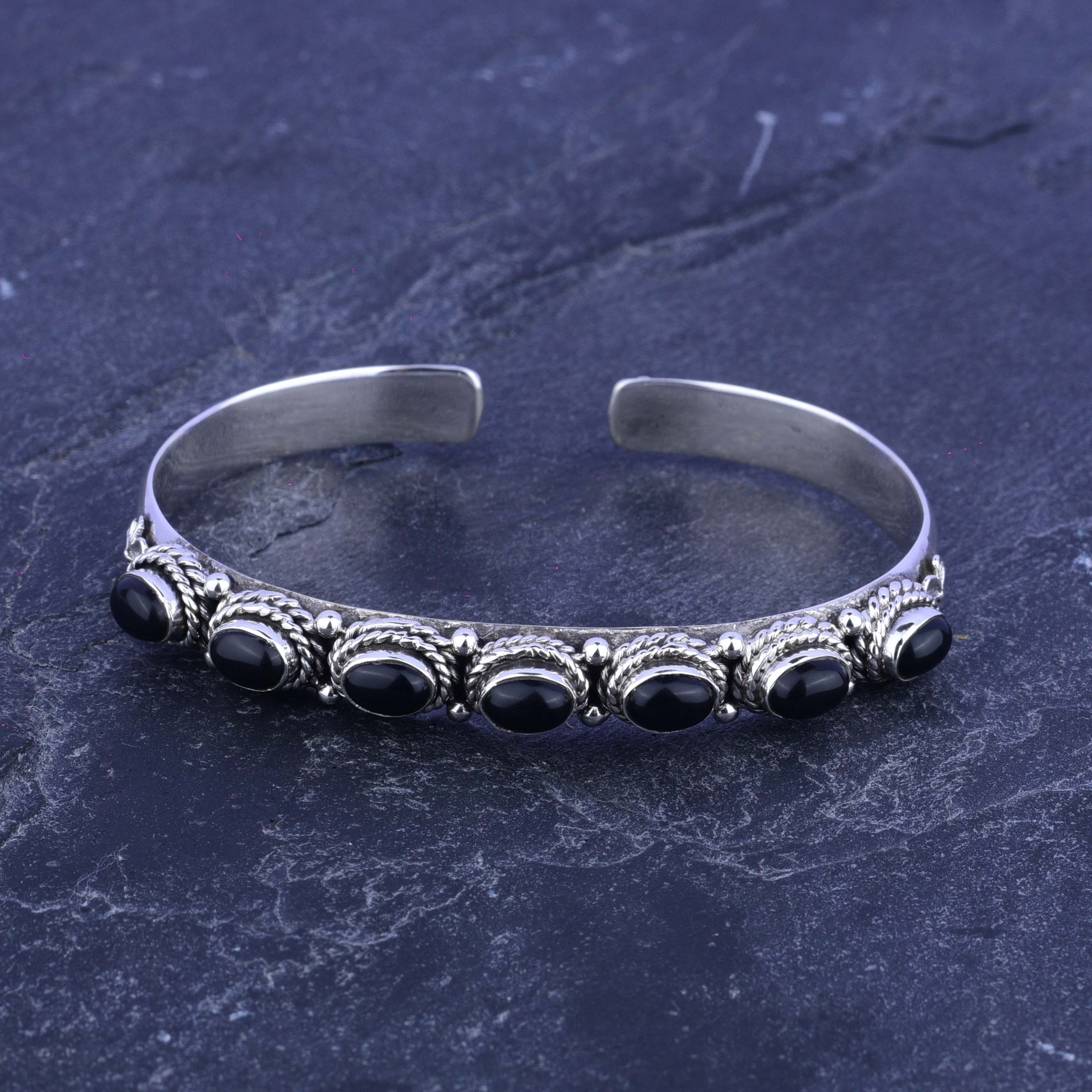 Black Onyx Cabochon Designer Stone Silver Bangle (34.3 Grm)
